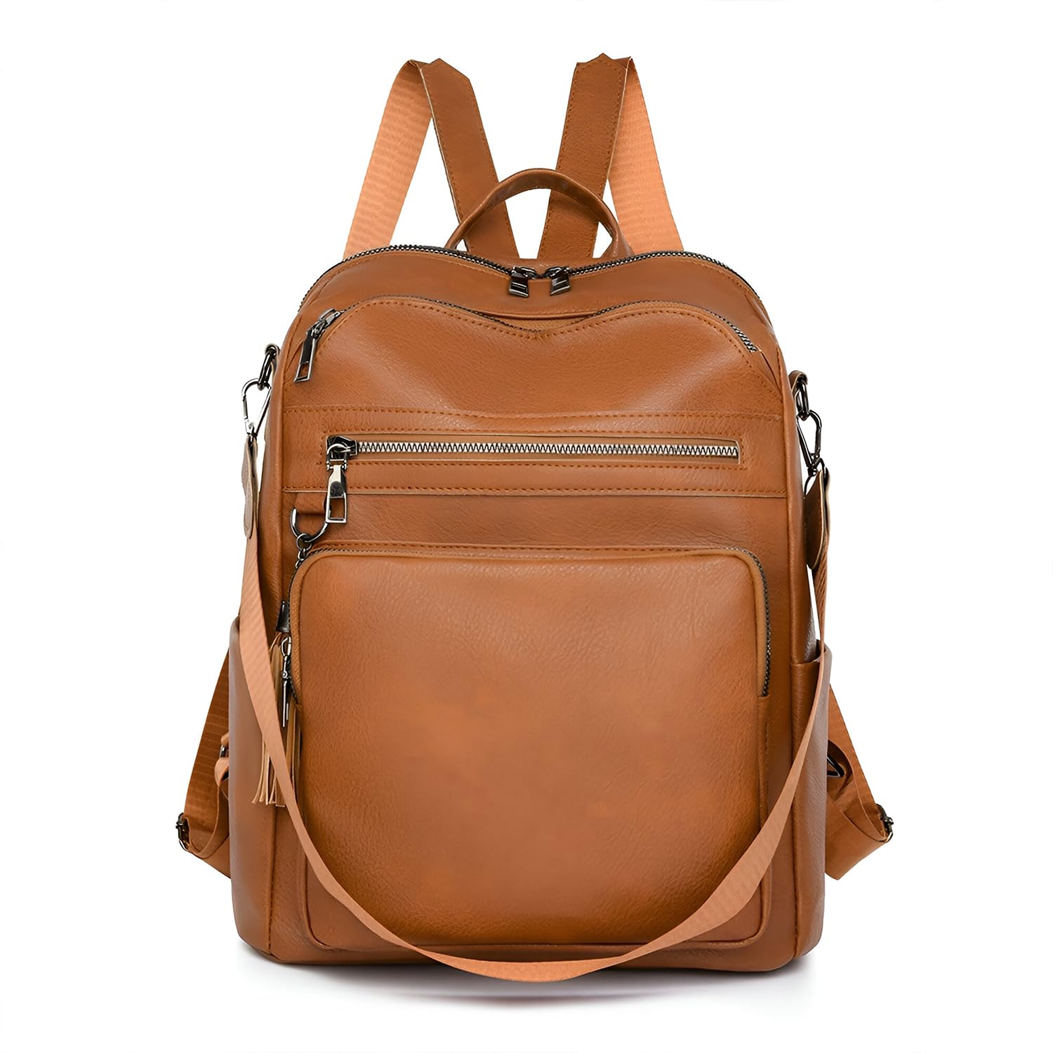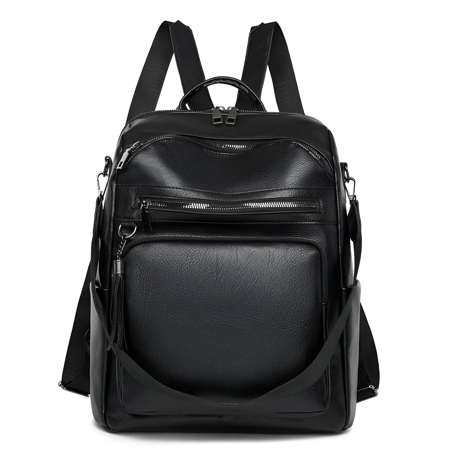 This sleek black backpack is made from premium faux leather with a smooth, slightly textured finish that adds a touch of sophistication. It features a roomy main compartment with multiple inner pockets to neatly organize essentials like gadgets, notebooks, and personal items. The front and side zipper pockets offer quick access to frequently used items, making it perfect for work, travel, or everyday use. Its structured design and adjustable straps ensure both style and comfort. Whether you're heading to the office or a casual outing, this bag fits right in. A great gift choice for professionals or students, it's easy to maintain with a simple wipe-clean.