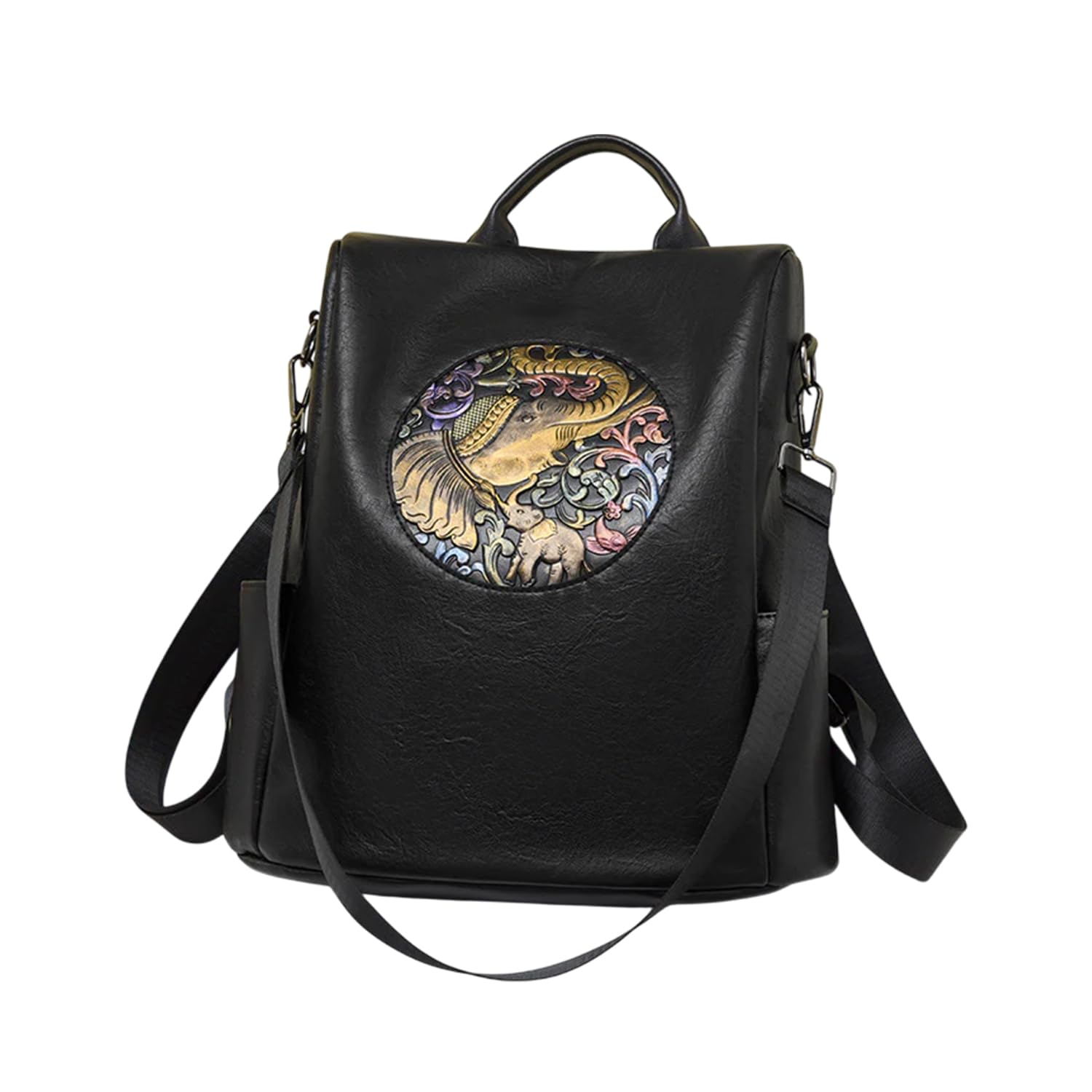 This beautifully crafted backpack is made from premium faux leather, offering both durability and a soft, stylish texture. Its standout feature is the artistic embossed elephant design, adding a bold and elegant charm to your everyday look. The spacious main compartment, along with inner pockets, allows easy organization of essentials like phones, tablets, wallets, cosmetics, and notebooks. Designed to balance fashion and function, this backpack suits both casual outings and modern city styles. It also makes a thoughtful and eye-catching gift for birthdays, holidays, or special surprises. Simply wipe clean with a damp cloth to maintain its shine and store in a cool, dry place for lasting beauty.