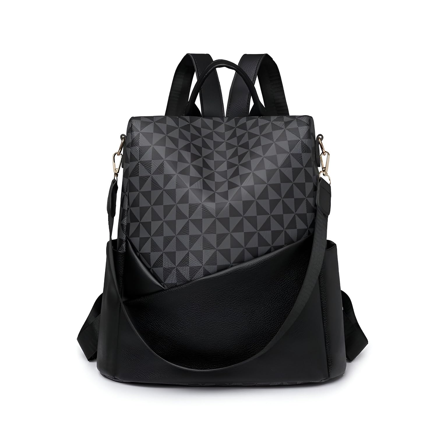 This beautifully designed backpack is made from premium PU leather, offering a smooth texture and long-lasting durability. Featuring an eye-catching geometric pattern, the bag exudes modern elegance while maintaining versatile, everyday appeal. The well-organized interior includes a spacious main compartment, zippered pockets, side slip pockets, and a hidden back pocket for keeping essentials secure. Whether used for work, school, or casual outings, its roomy yet stylish structure ensures both comfort and fashion. It also makes a thoughtful gift for anyone who loves sleek and functional accessories. Easy to maintain — just wipe clean with a damp cloth!