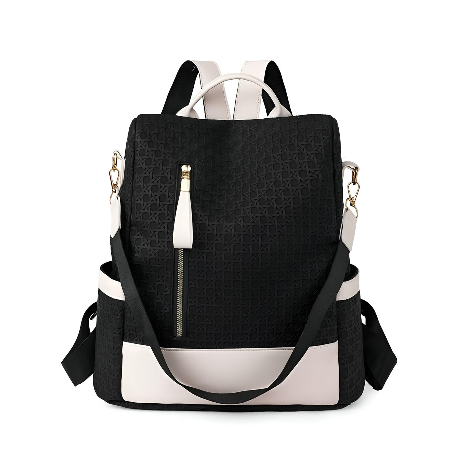 This backpack combines modern functionality with a stylish geometric textured pattern, crafted from durable Oxford cloth for reliable daily use. The soft, structured design includes a roomy main compartment, multiple zippered pockets, side slip pockets, and a back pocket — keeping all your essentials secure and well-organized. Its versatile and sleek shape makes it easy to match with both casual and smart outfits, offering both comfort and style on the go. Whether for work, travel, or shopping, this backpack is designed to meet your needs without compromising on fashion. The elegant geometric pattern enhances its contemporary appeal, making it a standout piece for your wardrobe.