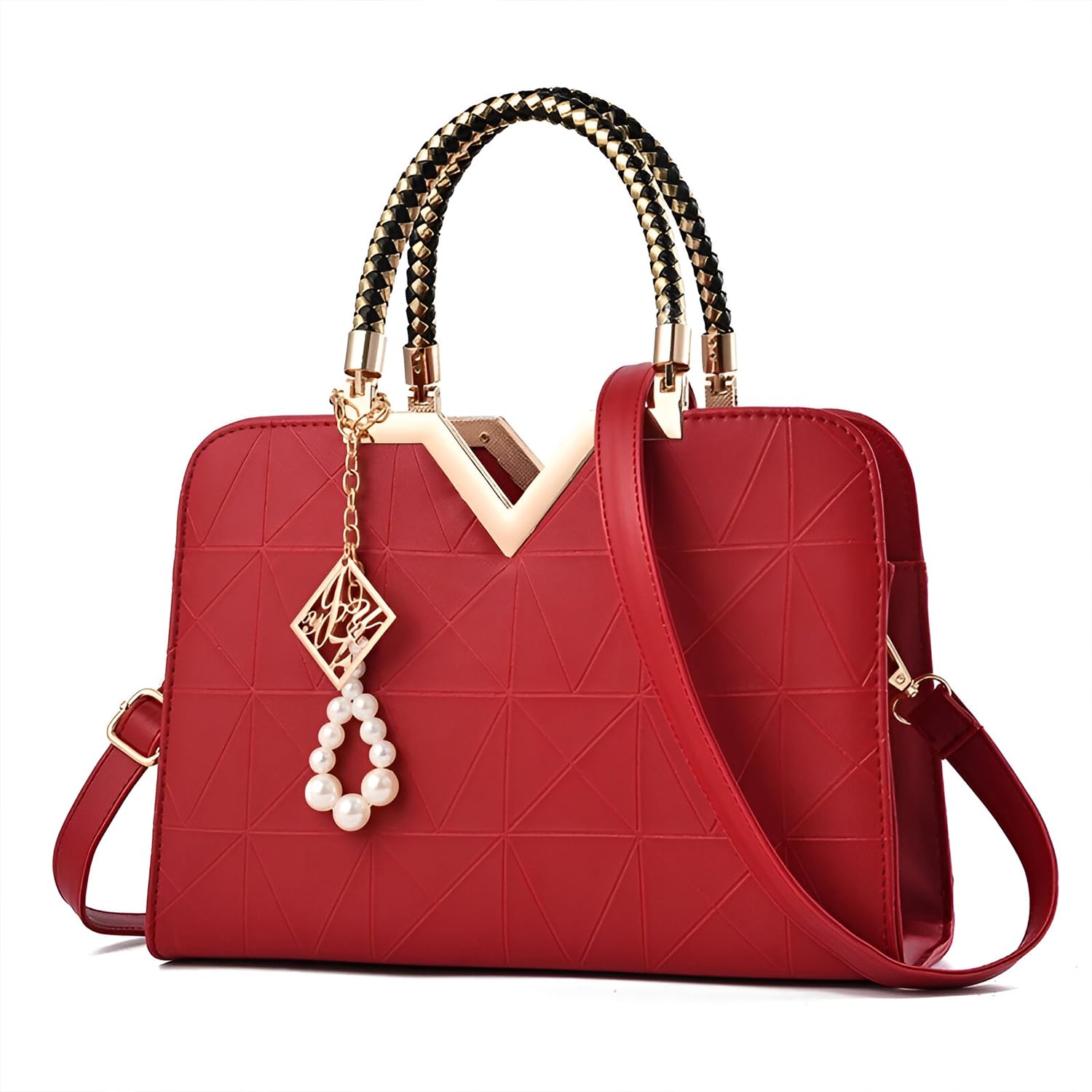 Elevate your style with this sophisticated SYGA women's handbag, featuring an elegant geometric-textured PU leather exterior in a luxurious beige shade. The distinctive double braided handles in black and gold add a touch of glamour, while the V-shaped metal accent and pearl charm pendant create an eye-catching detail. This versatile bag comes with multiple compartments, including a zipper hidden pocket, mobile phone pocket, and ID pocket, all lined with durable polyester cotton. The practical design includes both top handles and an adjustable shoulder strap for versatile carrying options. Perfect for both casual outings and formal occasions, this spacious messenger bag combines functionality with contemporary fashion. Available in various colours including White, Wine Red, Dark Blue, Black, Rose Pink, and Light Blue, this handbag offers both style and practicality for the modern woman.