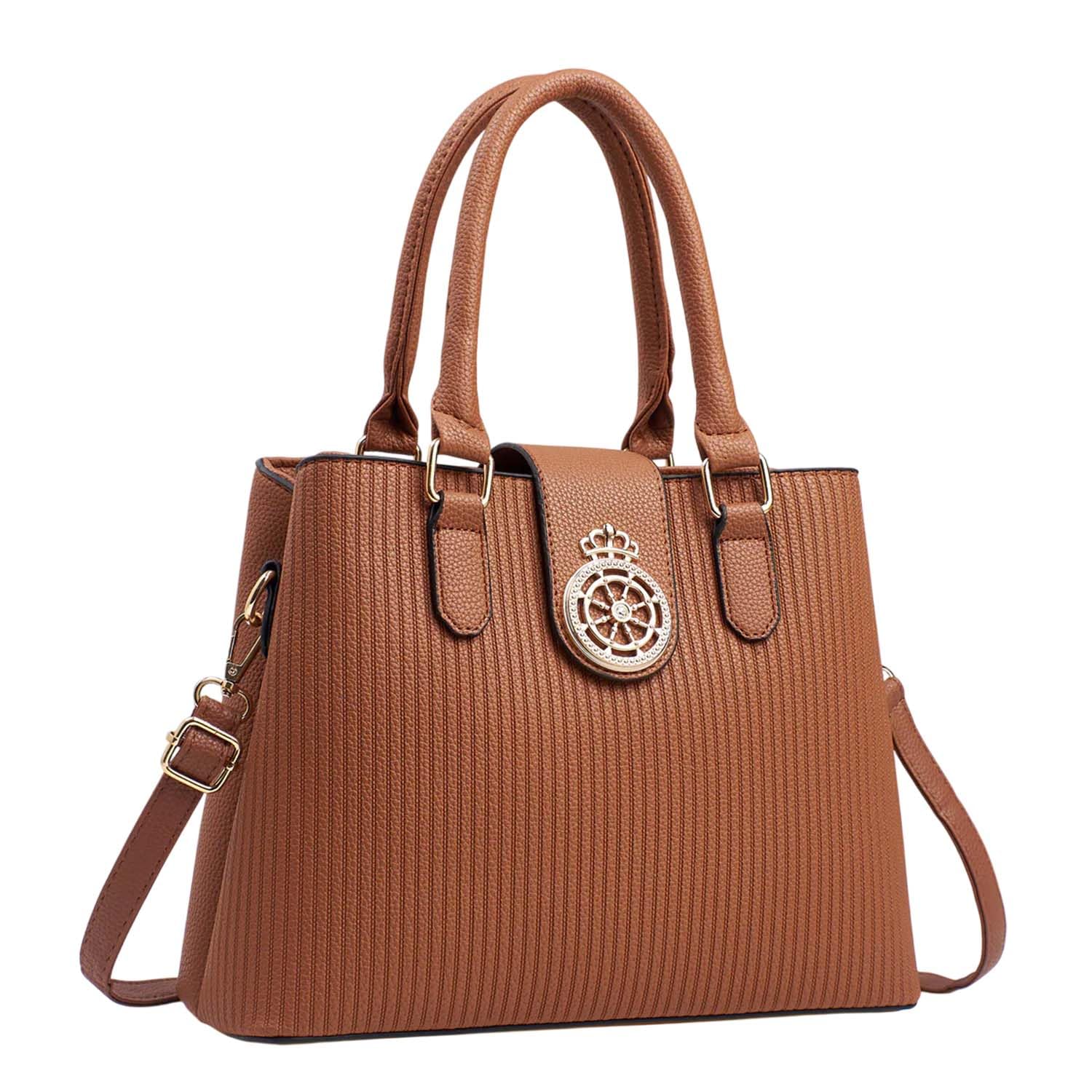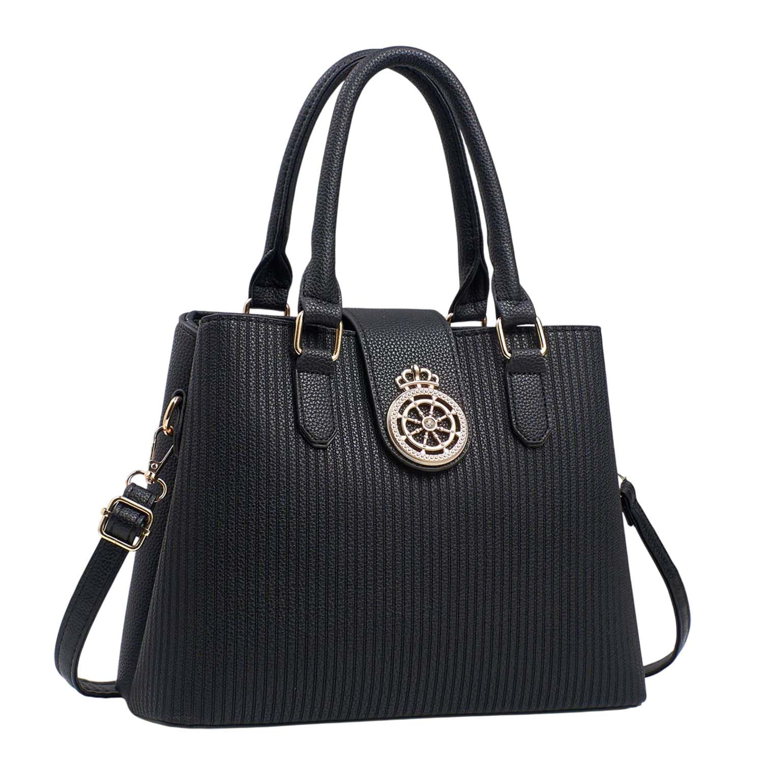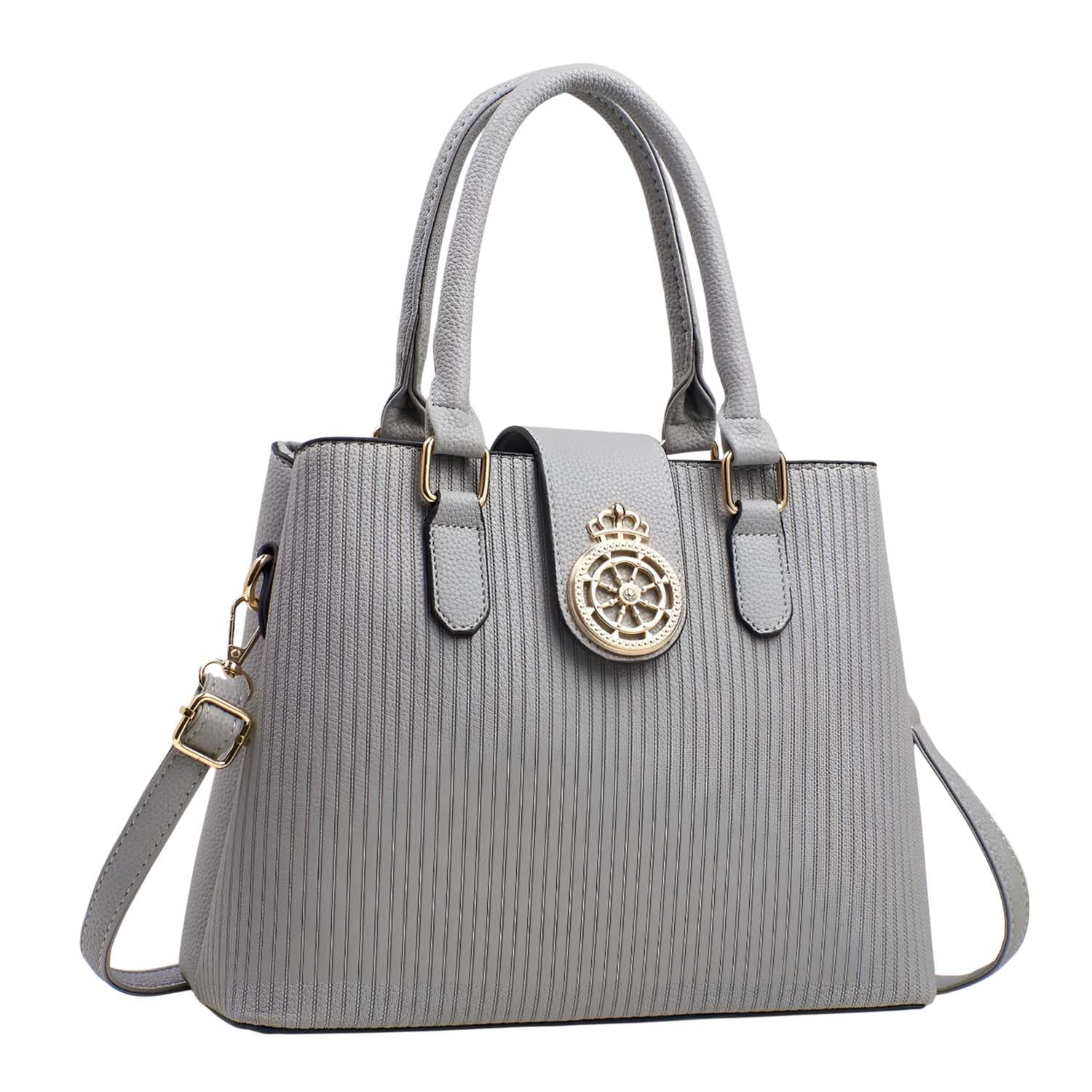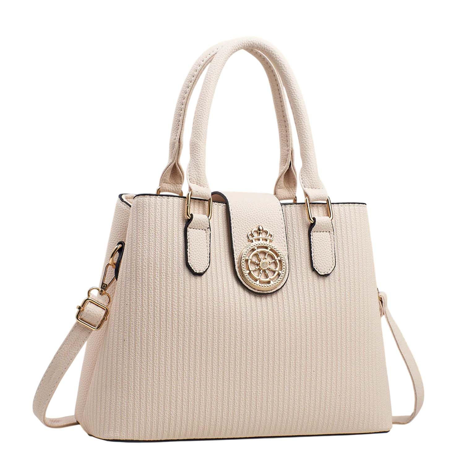 Elevate your everyday style with this sophisticated SYGA striped bucket handbag. Featuring an elegant crown emblem medallion on its textured PU exterior, this versatile bag combines fashion with functionality. The spacious multi-layer design, measuring 30 cm in length, 23 cm in height, and 12.5 cm in width, offers ample storage for all your essentials. The bag's cotton lining ensures your belongings stay protected, while the adjustable shoulder strap allows for comfortable crossbody wear. Available in various colours including blue, grey, apricot, khaki, off-white, and black, this trendy messenger bag complements any outfit. The structured silhouette with vertical striped detailing and gold-tone hardware adds a touch of sophistication. Perfect for both work and casual outings, this fashionable handbag offers the ideal blend of style and practicality for the modern woman.
