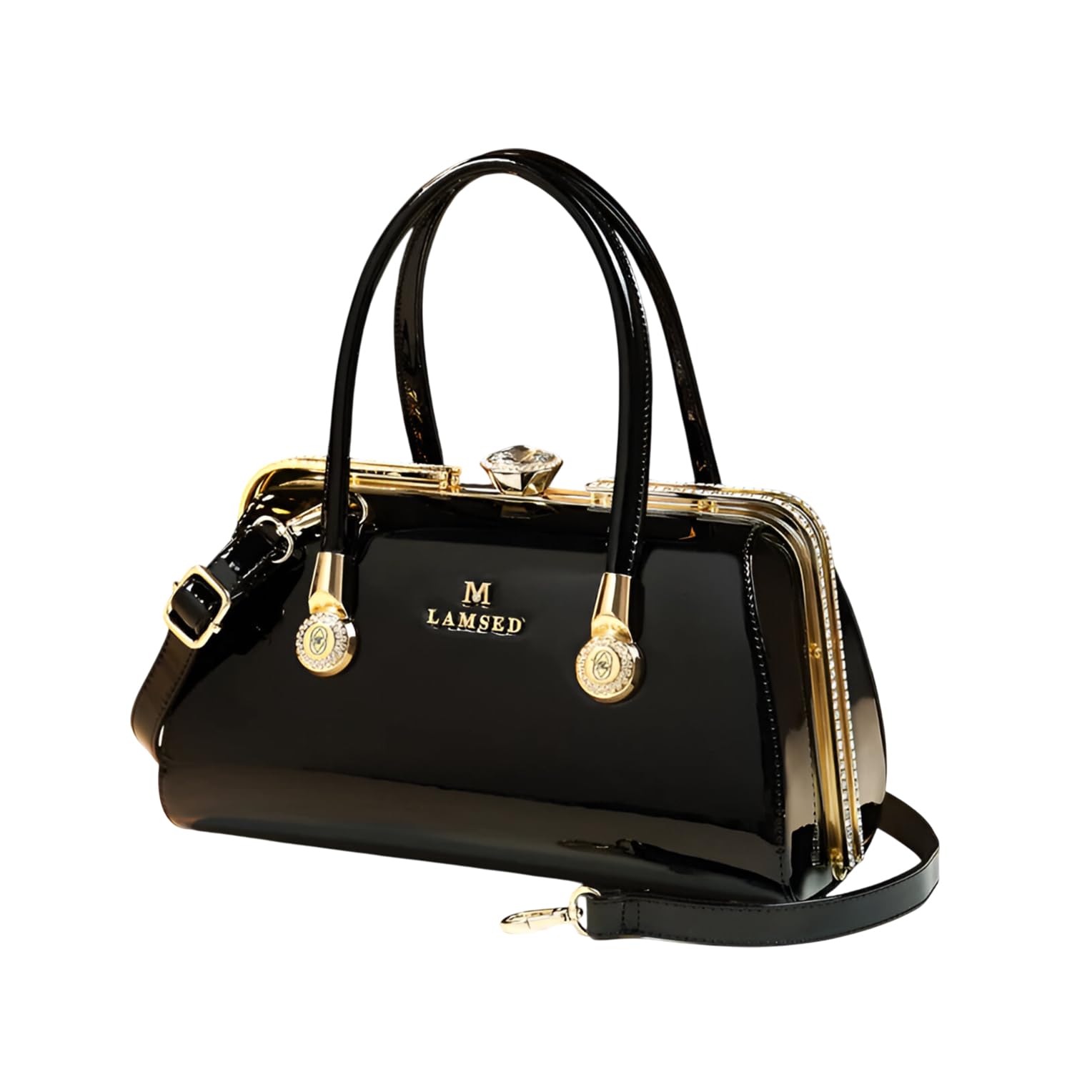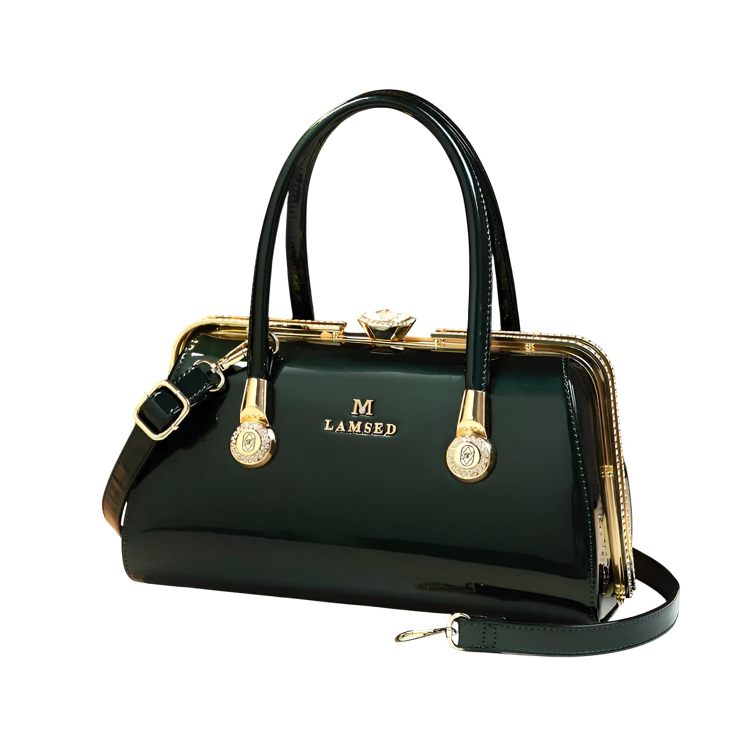 SYGA Women's Patent Leather Boston Bag. Designed in a chic pillow shape with dazzling rhinestone and diamond accents, this handbag combines fashion with functionality. Crafted from high-quality PU patent leather, it features a durable polyester lining and a secure lock opening. The spacious interior includes multiple compartments to keep your essentials neatly organized. Perfect for daily outings, dinners, or special occasions, it also makes an excellent gift for stylish women. Available in wine red, green, black, and leopard print.