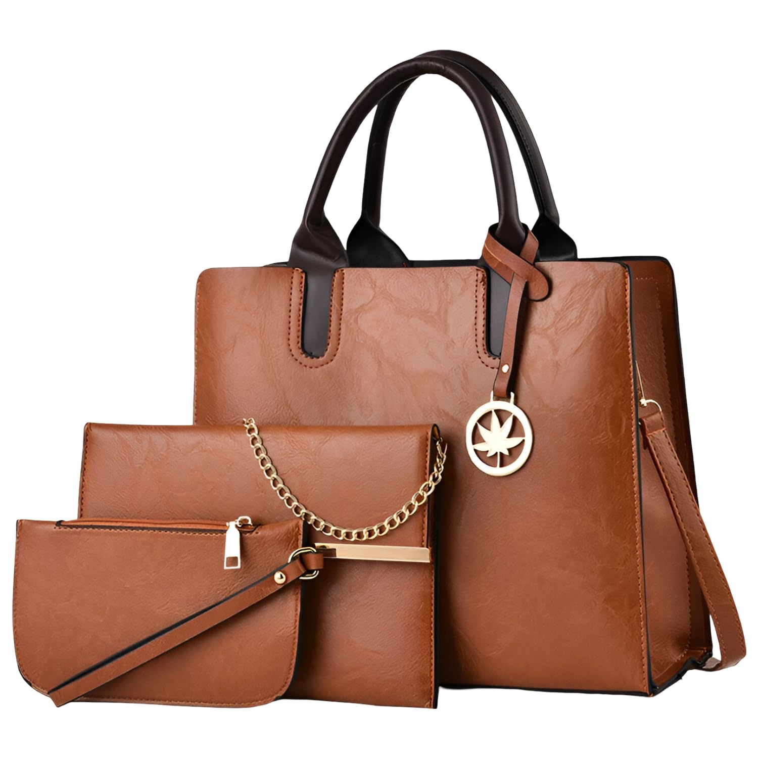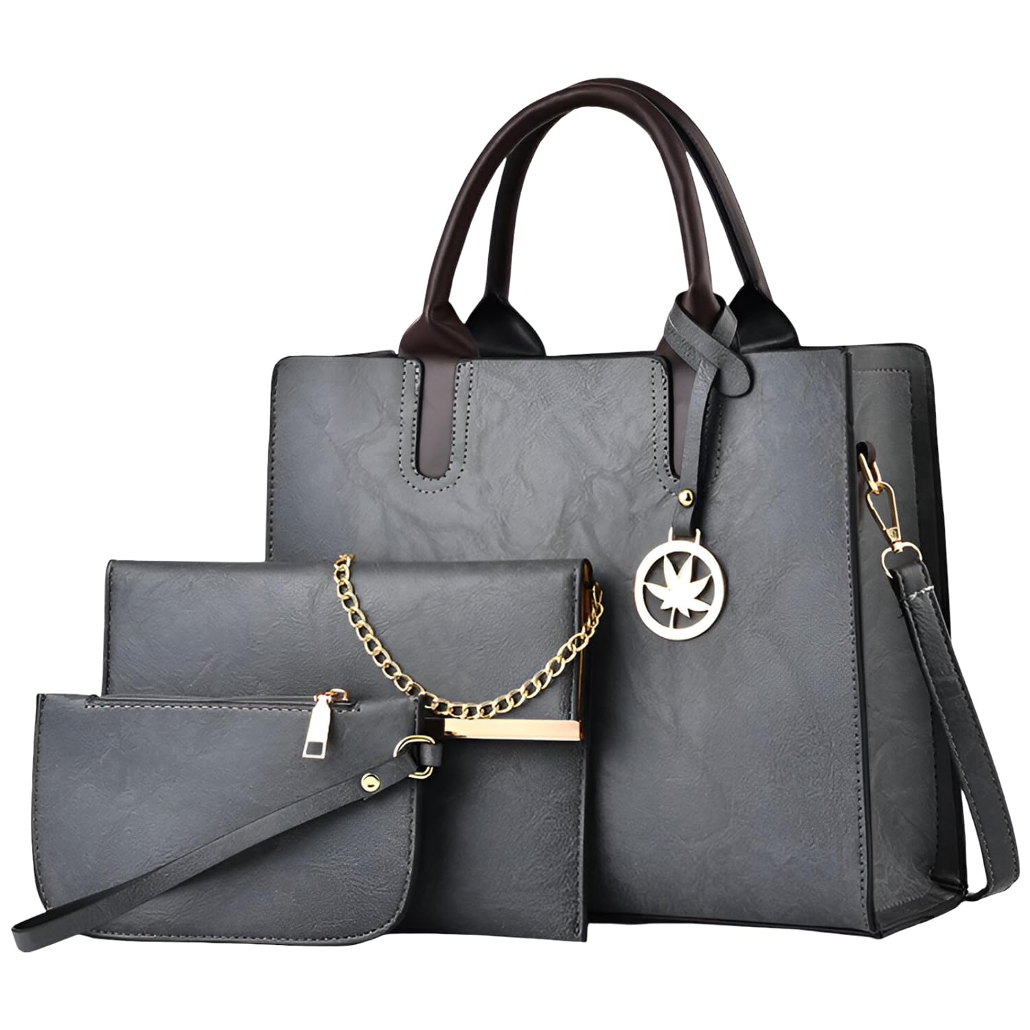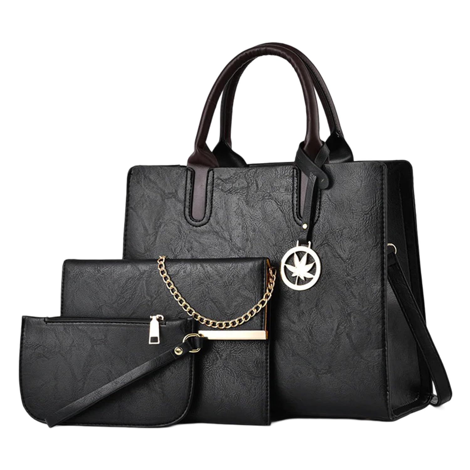 SYGA 3-piece handbag set, including a large tote, chic sling bag, and handy wallet. Crafted with premium PU leather and detailed with sewing thread and chain accents, it offers both style and durability. Its vertical square shape and spacious interiors ensure you stay organized on the go. Ideal for everyday errands, office use, and special occasions, this set also makes a perfect gift for your loved ones.