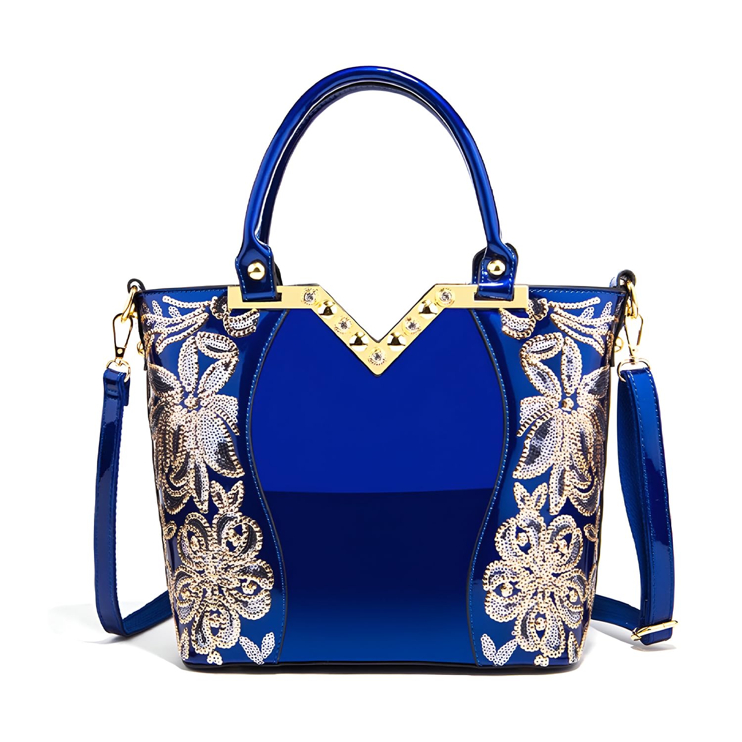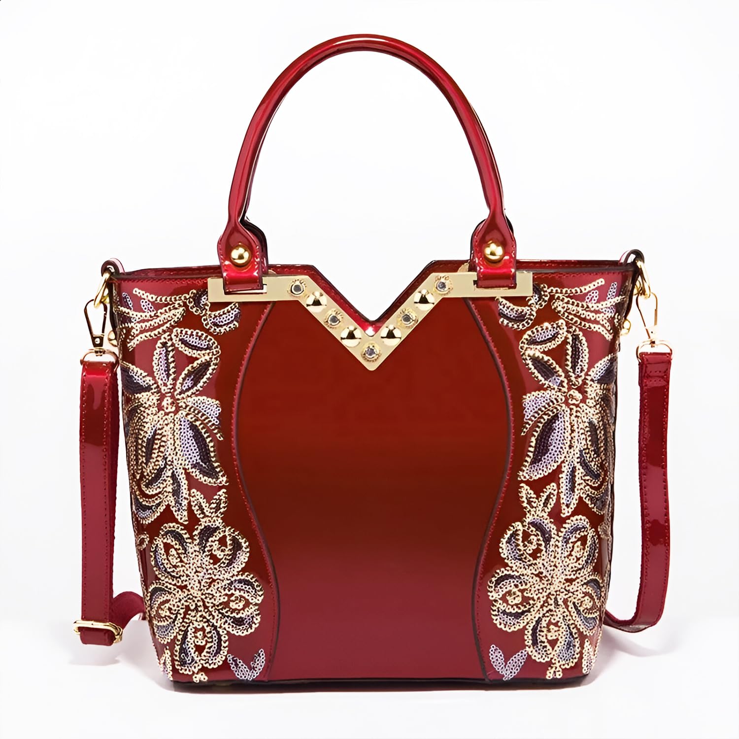 Popular Elements: Contrasting colors, floral embossing, pearl + rivet detail