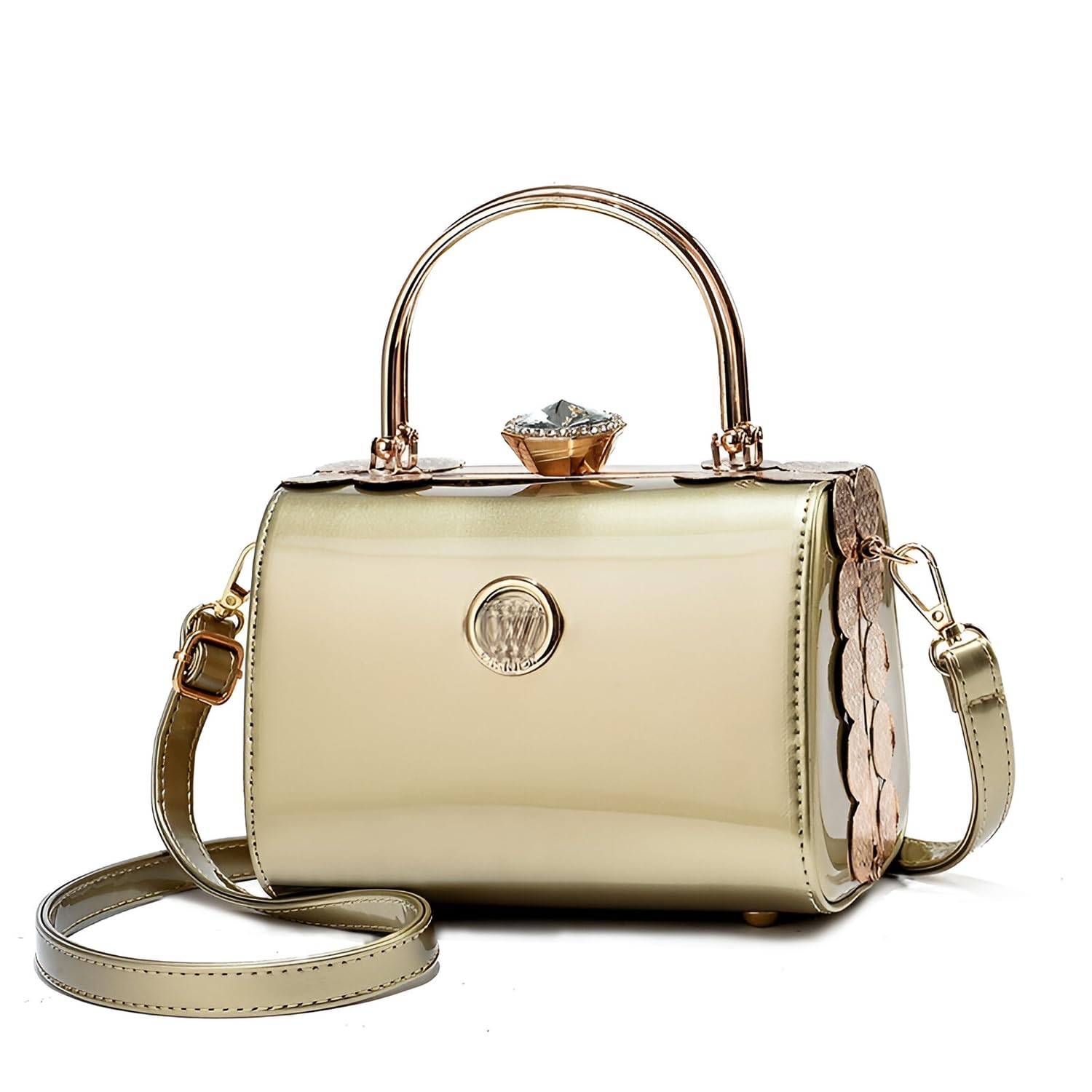 SYGA Women's Hard Shell Handbag — a luxurious statement piece designed for modern fashionistas. Made from premium PU leather, this bag dazzles with a metal frame, secure gem twist-lock, and golden handle. Its spacious interior includes practical compartments to keep your essentials neatly organized, while the removable crossbody strap offers versatile carrying options. Available in elegant shades like wine red, black, blue, and gold, this handbag is perfect for both everyday use and special events.
